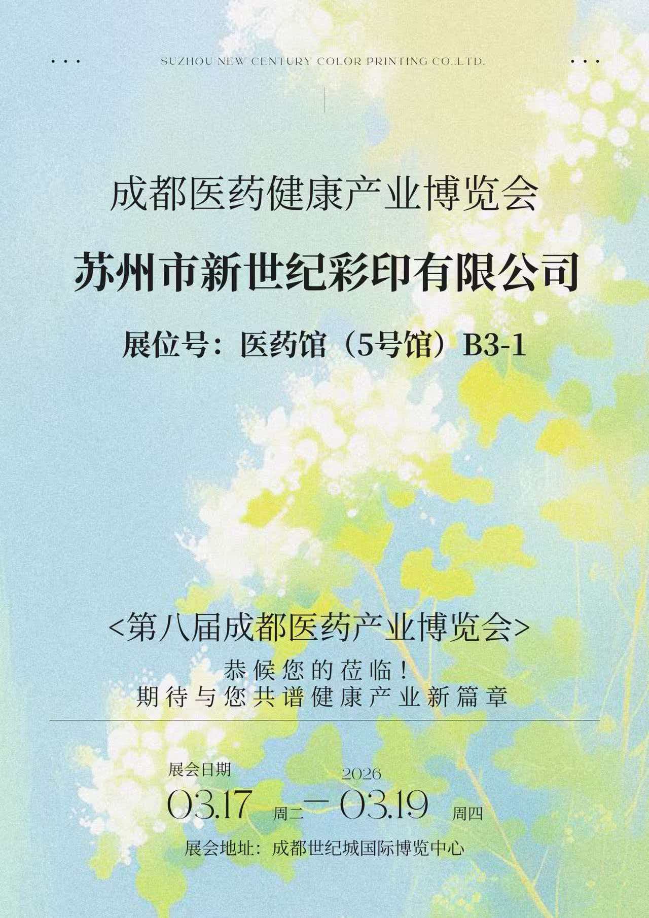 Du 17 au 19 mars 2026, la 8e Exposition de l'industrie médicale et de la santé de Chengdu s'est tenue en grande pompe au Centre international de congrès et d'expositions de Chengdu Century City. Suzhou New Century Color Printing Co., Ltd. (ci-après dénommée « New Century Printing ») a dévoilé ses dernières réalisations dans le domaine de l'emballage pharmaceutique à l'occasion du stand B3-1 dans le hall pharmaceutique (hall 5), présentant de manière exhaustive sa force globale en matière d'impression d'emballages pharmaceutiques, de conception structurelle et de services de conformité. Il a attiré de nombreuses sociétés pharmaceutiques et experts de l'industrie pour s'arrêter et échanger des idées.